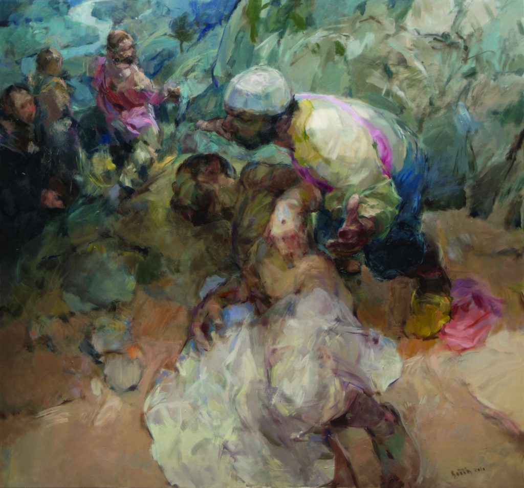 The Mandorla Committee grieves the loss of the Rev Bob Booth, who’s faith and love for God shone through in his love for others and in the creation of art. Bob was recipient of a highly commended prize and the People’s Choice in 2010, contributing a contemporary interpretation of that year’s theme, “Who is my neighbour?” (Luke 10:25-37). Reflecting on that artwork, pictured below, he informed the Committee that the addition of a recognisably Muslim head dress was an impulse of the Spirit felt in the completion of the painting.