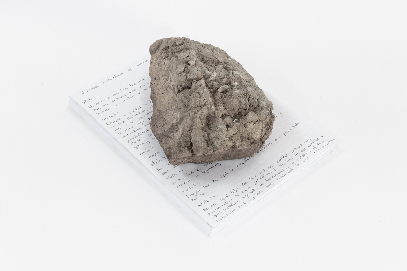Image credit: Belinda Yee, With these words (a secular prayer), 2024, a socially-engaged project where over 60 people have hand written the Universal Declaration of Human Rights – ink on office paper, concrete aggregate, 25 x 21 x 29 cm. Courtesy and copyright the Artist.